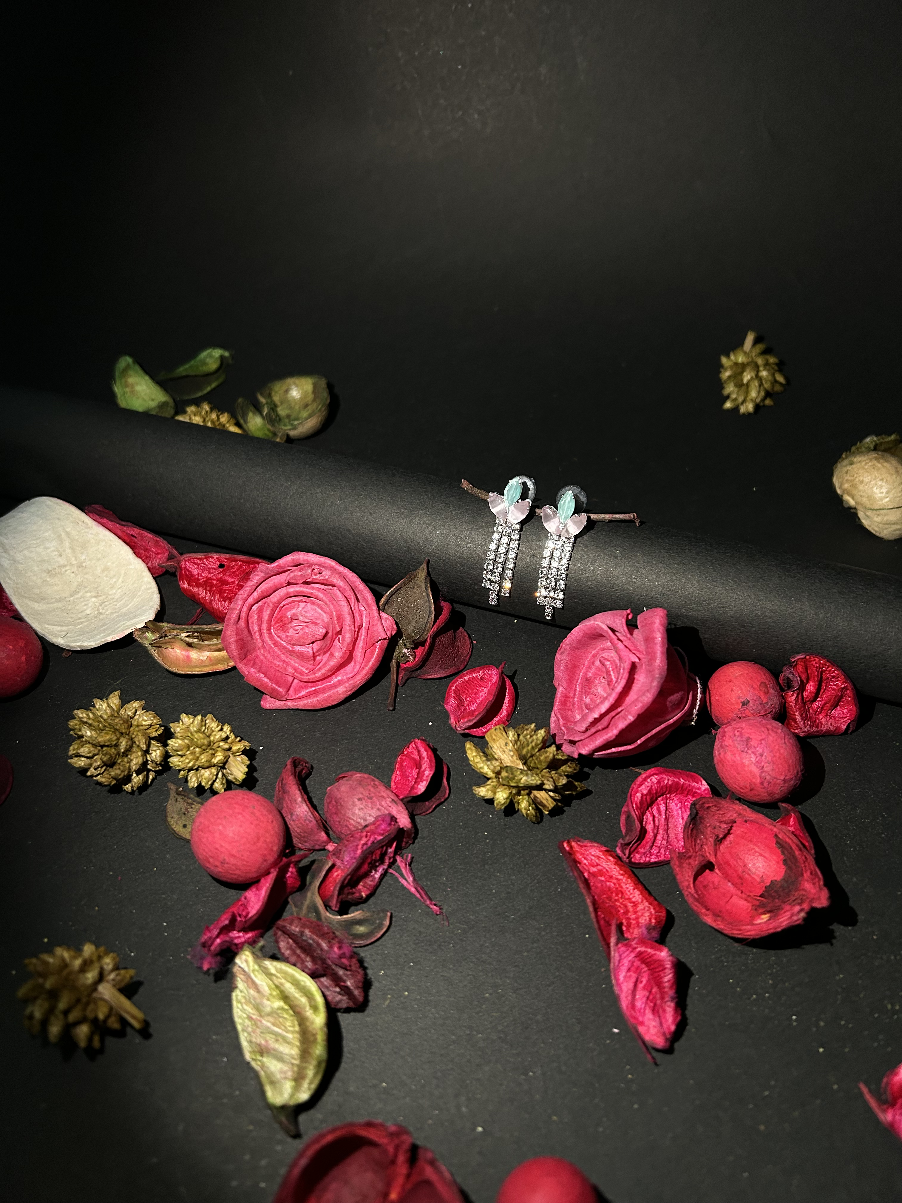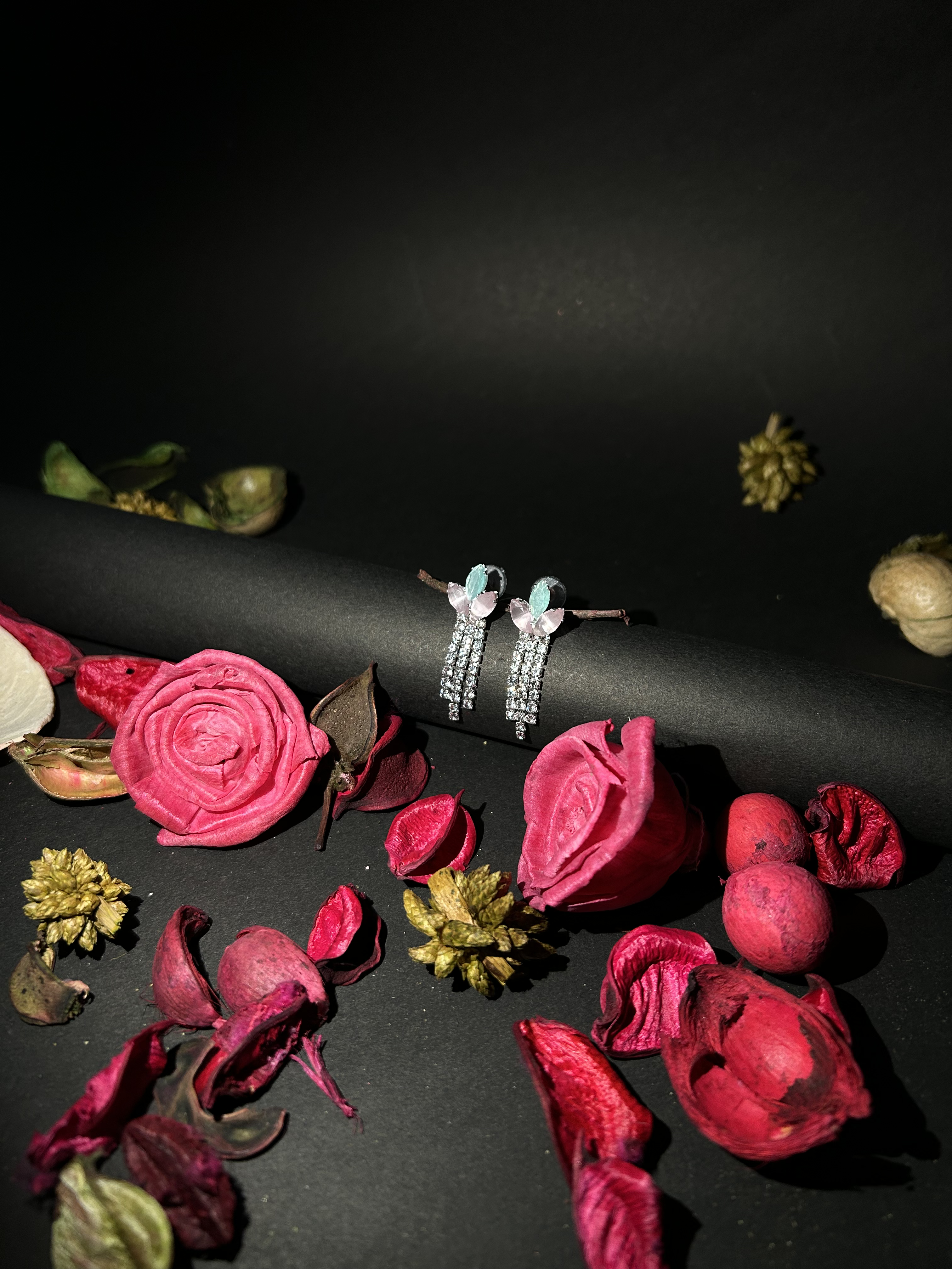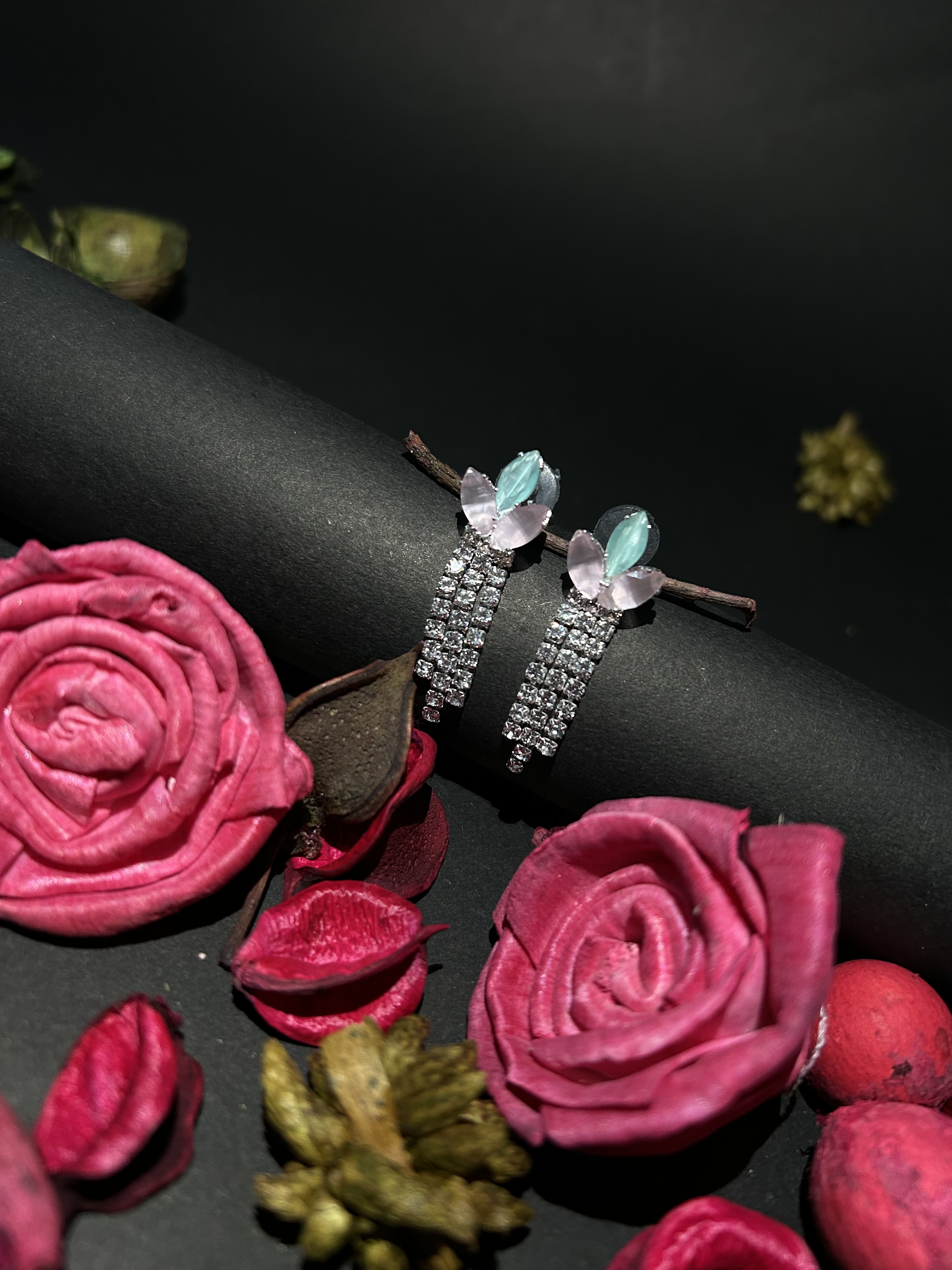 The chic top stud is crafted in an elegant fan or leaf motif, accented with beautiful pastel mint and blush pink crystals, adding a soft, modern touch to the overall glamour. These earrings are designed to give you the expensive look of real fine jewelry, making them a perfect head-turner.
